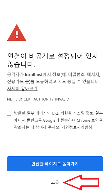 PC나 휴대폰의 크롬 브라우저로 https://서버IP:3000으로 접속하면 다음과 같은 경고창이 실행된다.