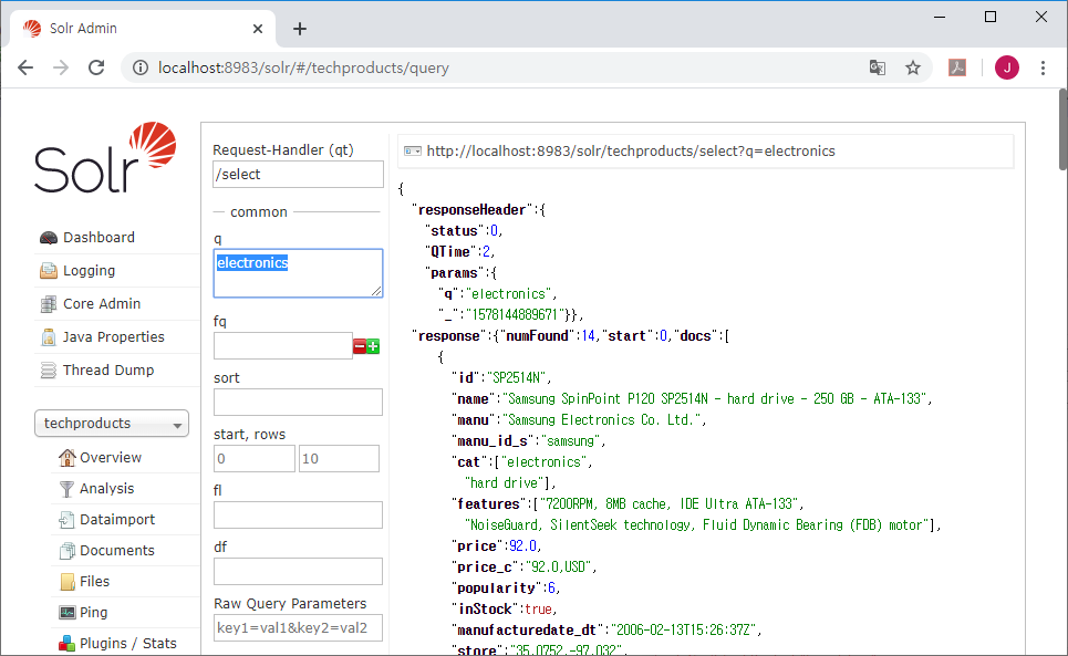 앞서서 Solr의 기술 제품 예제를 실행시켜봤다.