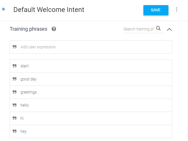 모두 고객의 예상되는 대답(Traning phrases)과 그것에 대한 챗봇의 대답(Response) 구조로 되어있다.