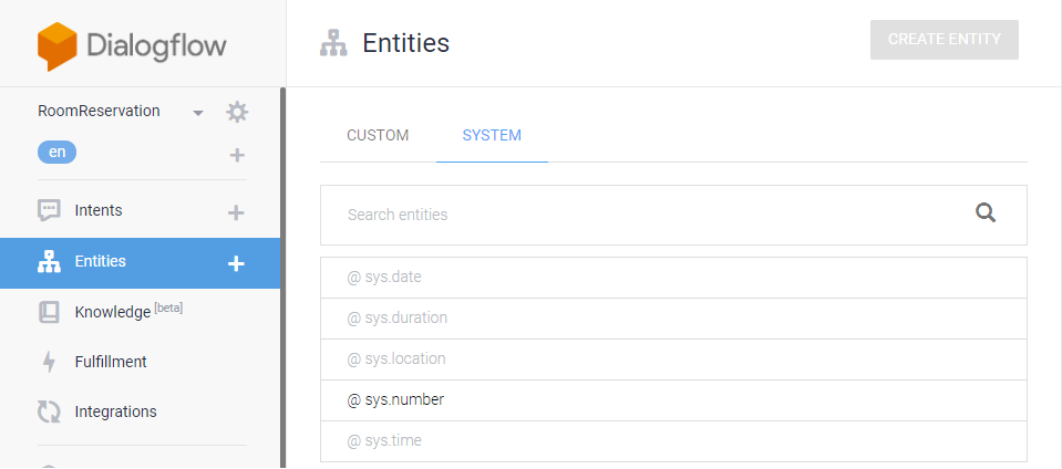 [SYSTEM]은 Dialogflow가 제공하는 것으로 숫자(number), 날짜(date), 위치(location) 등의 개체들이 정의 되어 있다.