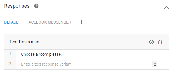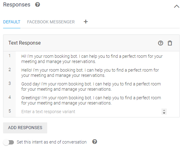 Response(대답)에서는 [Enter a text response variant]에 새로운 문장을 입력해서 추가한다.
