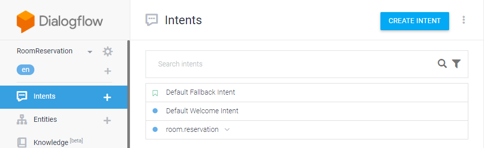 Dialogflow가 기본 제공하는 2개 intent와 가져오기로 추가된 1개의 intent가 있다.