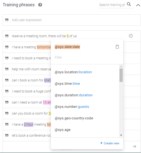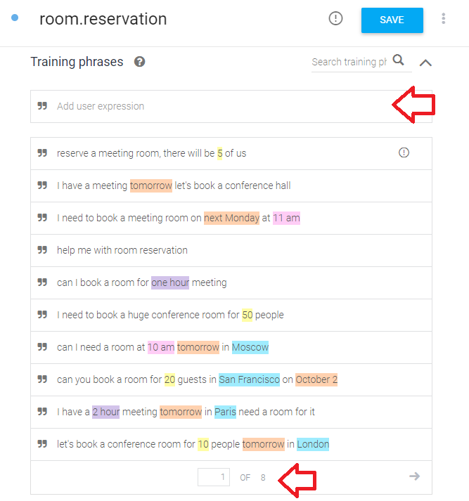 Training phrases(학습문장)은 고객이 입력하는 문장으로,