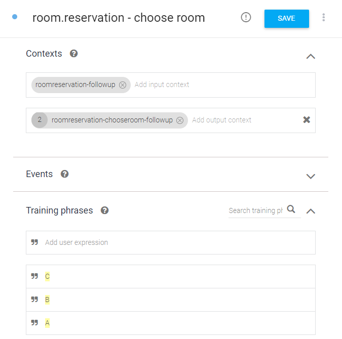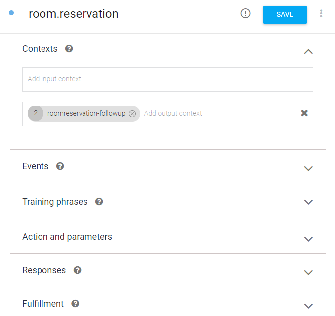 그림처럼 room.reservation이 끝나면 실행되고(input context), 끝나면 확인 Intent(output context)가 실행된다.