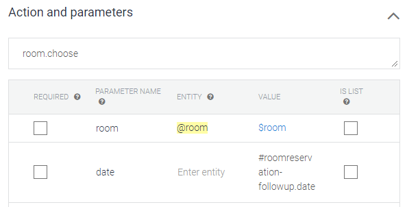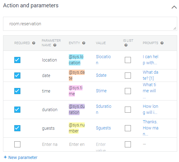 대화를 통해 정보를 수집하기 위한 Action and parameters가 작성되었다.