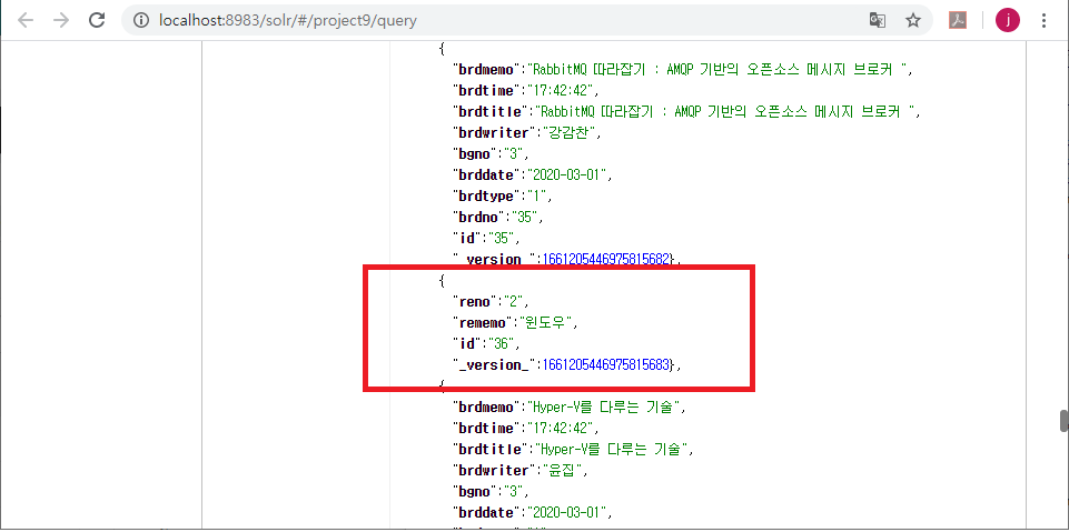 데이터가 직관적으로 저장되지 않아서 개인적으로 Solr가 Elasticsearch보다 조금 부족한 부분이라고 생각하는데,