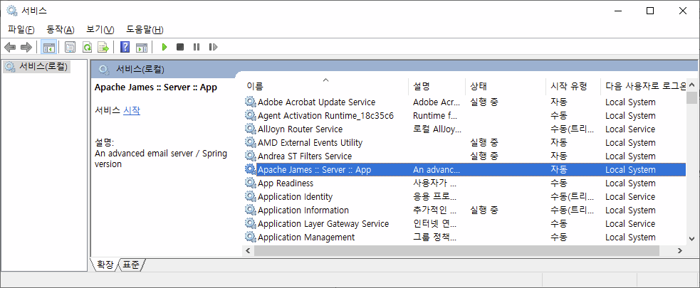 윈도우 서비스 창에서 실행 버튼을 눌러 실행해도 되고, 콘솔 창에서 james.bat start로 실행해도 된다.