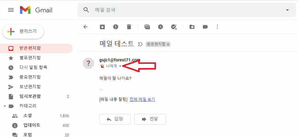 수신한 메일에서 [나에게] 옆에 빨간색 아이콘을 클릭하면 다음과 같은 그림을 볼 수 있다.