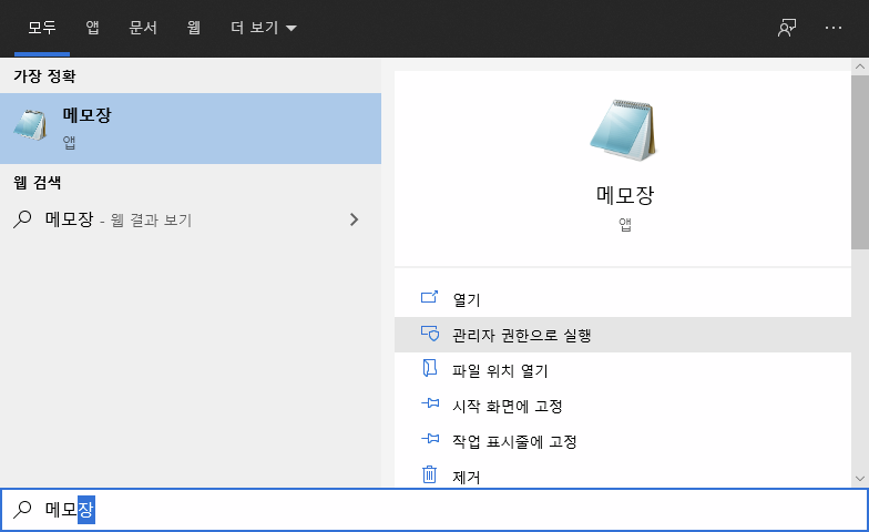 먼저 James를 설치한 PC가 윈도우일 경우에는 윈도우 시작 메뉴에서 관리자 권한으로 메모장을 실행하고,
