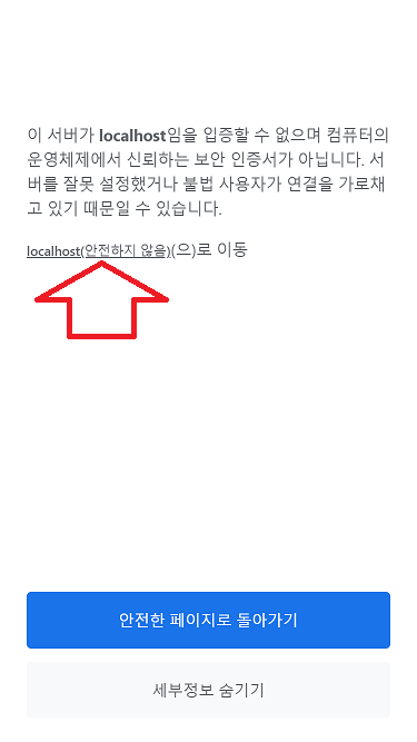 PC나 휴대폰의 크롬 브라우저로 https://서버IP:3000으로 접속하면 다음과 같은 경고창이 실행된다.
